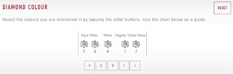 As you can see, only 5 colours are available from F to J. G or H are good colours, above this level and the diamond doesn’t look much whiter, but is much more expensive, below this level and the diamond can look yellow (which most people don’t like).