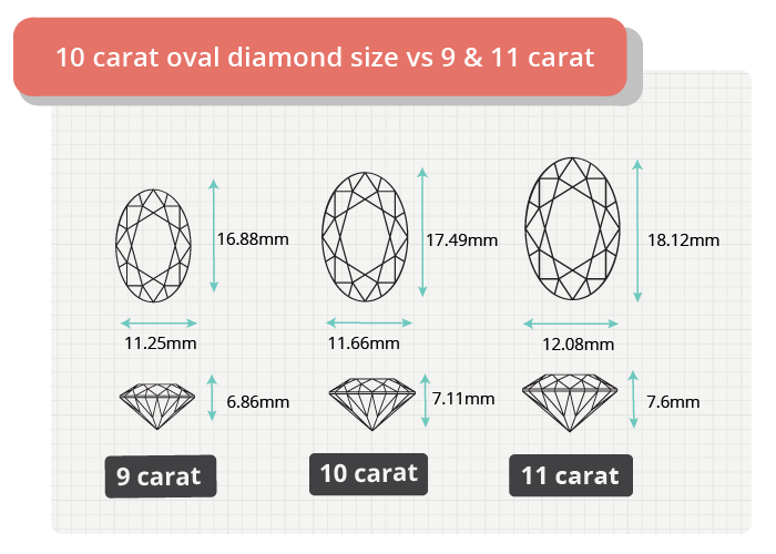 A typical A typical 10 carat oval diamond may be around 17.49mm × 11.66mm × 7.11mm.