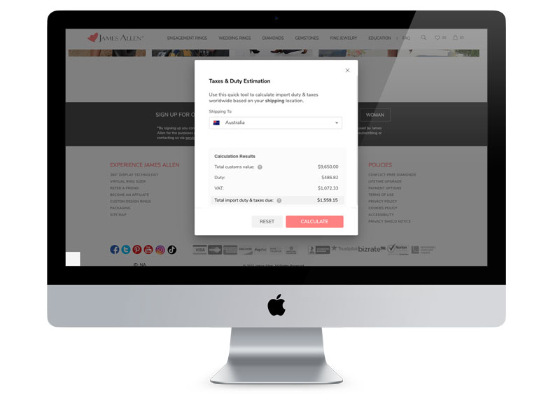 You can enter the cost of your ring and find out the total of the import duty, GST tax and other charges that will be payable.