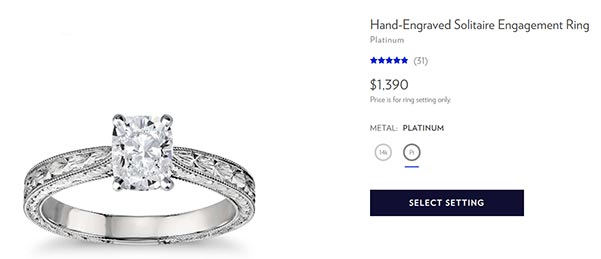 Next up we have an added touch of elegance and visual interest on Katherine’s classic style. This setting features delicate hand engraving along its platinum band. Click here to learn some more about this Hand-Engraved Solitaire Engagement Ring from my recommended retailer Blue Nile.