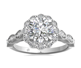 Halo settings feature a ring of smaller stones around the center stone. There are some big advantages to this – it adds considerable bling to the ring, without the large associated increase in price that a dramatically larger center stone would add.